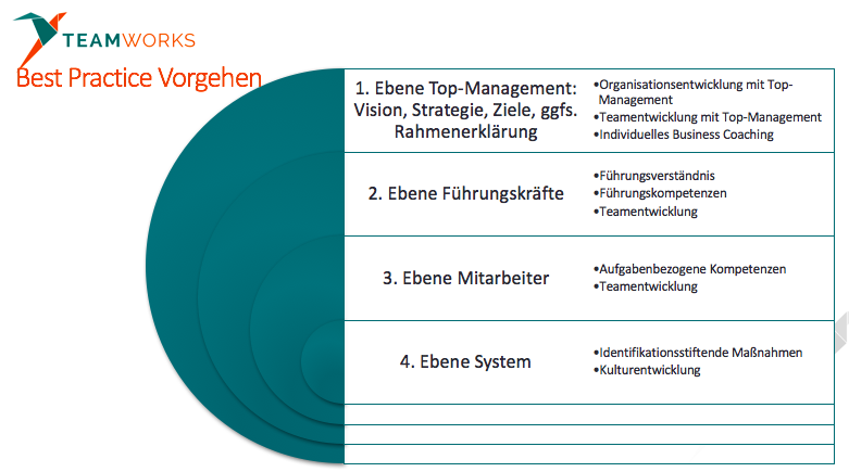 Relevant sind die Ebenen Top-Management, Management, Mitarbeiter und System. Oft wird die Führungsebene von Teamentwicklungsmaßnahmen ausgenommen. Man sieht sich nicht als Team, überlässt das Zusammenarbeiten denen unten. Statt dessen investiert man in Business Coaching für Führungskräfte. Dieser Fokus auf das Individuum ist nicht mehr zeitgemäß. Kooperation ist gerade auch auf der obersten Ebene nötig. Vor allem braucht man hier ein gemeinsames Verständnis von dem, was man anderen vorleben soll. Das schließt Einzelmaßnahmen zur Führungskräfteentwicklung nicht aus. “System” beinhaltet für uns Maßnahmen, die alle verbinden: Rituale, Räume, Orte, Technik, Veranstaltungen…. Diese sind besonders wichtig für die Identifikation mit dem Unternehmen.