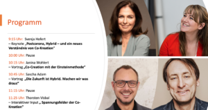 Selbstverständlich darf bei allem “Co” auch der Einzelne nicht zu kurz kommen. Die genialen und manchmal schwierigen Kreativ-Denker, die ganz schön fordern können. Aber nicht nur sie haben Ideen, jeder kann lernen, anders zu denken. Das zeigte unsere Trainerin und agile Coach Janina Wohlert mit ihrer wunderbar motivierenden und positiven Art. Nebenbei: Ihren Znipcast-Podcast mit Henri können wir jederzeit gern empfehlen. In ihrem Vortrag zeigte sie, dass es auf die richtigen Fragen ankommt – und auf emotionale Geschichten. Einen ganz anderen Punkt machte Sascha Adam, der die Beziehung von Co-Kreation zu künstlicher Intelligenz und New Work herstellte. Es geht ja auch um Mensch-Maschine-Kreation! Über seinen Vortrag wurde heiß diskutiert, denn wie genau sich die technologischen Möglichkeiten und menschliche Kreativität zu Lösungen für Menschheitsprobleme verbinden, ist alles andere als klar.