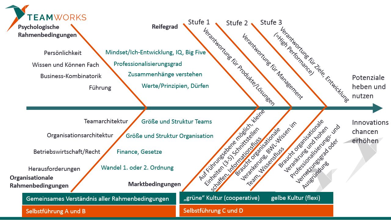 Ganz wichtig sind die Rahmenbedingungen und zwar auf der Ebene der Person und auf der Ebene der Organisation. Ein Team ist immer auch eingebettet in seinen Kontext. Da gibt es beispielsweise eine Finanzabteilung, mit der er es zusammenarbeiten muss – an die eigene Anforderungen gestellte werde und die aus verschiedenen Gründen planen muss. Hier entstehen schnell und Interessenkonflikte und Schnittstellen-Hindernisse.