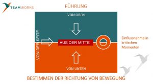 Laterale Führung nennen wir sie in unserem Modell der Führung als Bestimmung der Richtung von Bewegung und gezielte Einflussnahme in kritischen Situationen ist die Führung von der Seite. Wenn sie sich das bildlich vor Augen halten, erkennen sie wahrscheinlich sofort die Schwierigkeit: Von der Seite kann man an die Hand nehmen, begleiten, unterstützen, mitfahren. Man kann andere motivieren, voranzugehen. Das alles ist aber extrem kommunikationsintensiv. Und erfordert eine klare Steuerung. Wie wir uns bewegen, muss einigermaßen geregelt sein, sonst ist das Einflussnehmen stark an eine charismatische Persönlichkeit gebunden. Sind Regeln da, “reicht” eine innerlich klare, sichere und soziale Persönlichkeit.