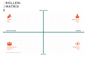 Der Weg durch unterschiedliche Rollen lässt sich leicht auf unserer Rollenmatrix nachzeichnen: Man besucht mehrere Quadranten. Sehr hilfreich ist es dabei zu verstehen, wo man sich gerade bewegt und warum der Rollenwechsel sinnvoll für das Team ist.