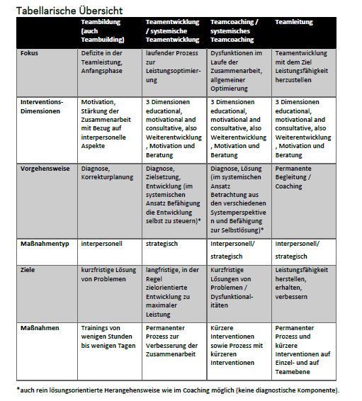 Eine zusammenfassende Übersicht der unterschiedlichen Definitionen sehen Sie unten. Eine Abgrenzung der Felder Teamentwicklung, Teamcoaching und Teamleitung ohne Homer und Micky Maus erhalten Sie hier.