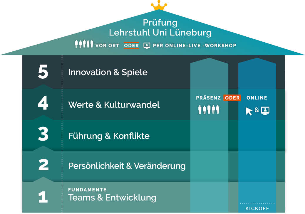 Unsere Ausbildung ist einzigartig, agil und ganz besonders: mit Svenja Hofert und Thorsten Visbal lernen Sie entweder in einer reinen Präsenz- oder Online-Gruppe Handwerk und Kunst der Teamgestaltung kennen. Dies beinhaltet Teamentwicklung, Teambildung und Teamcoaching, stets mit dem Blick auf die Organisation, Veränderung und Kulturwandel. Kreativ und aktiv – deshalb nennen wir es Teamgestaltung!